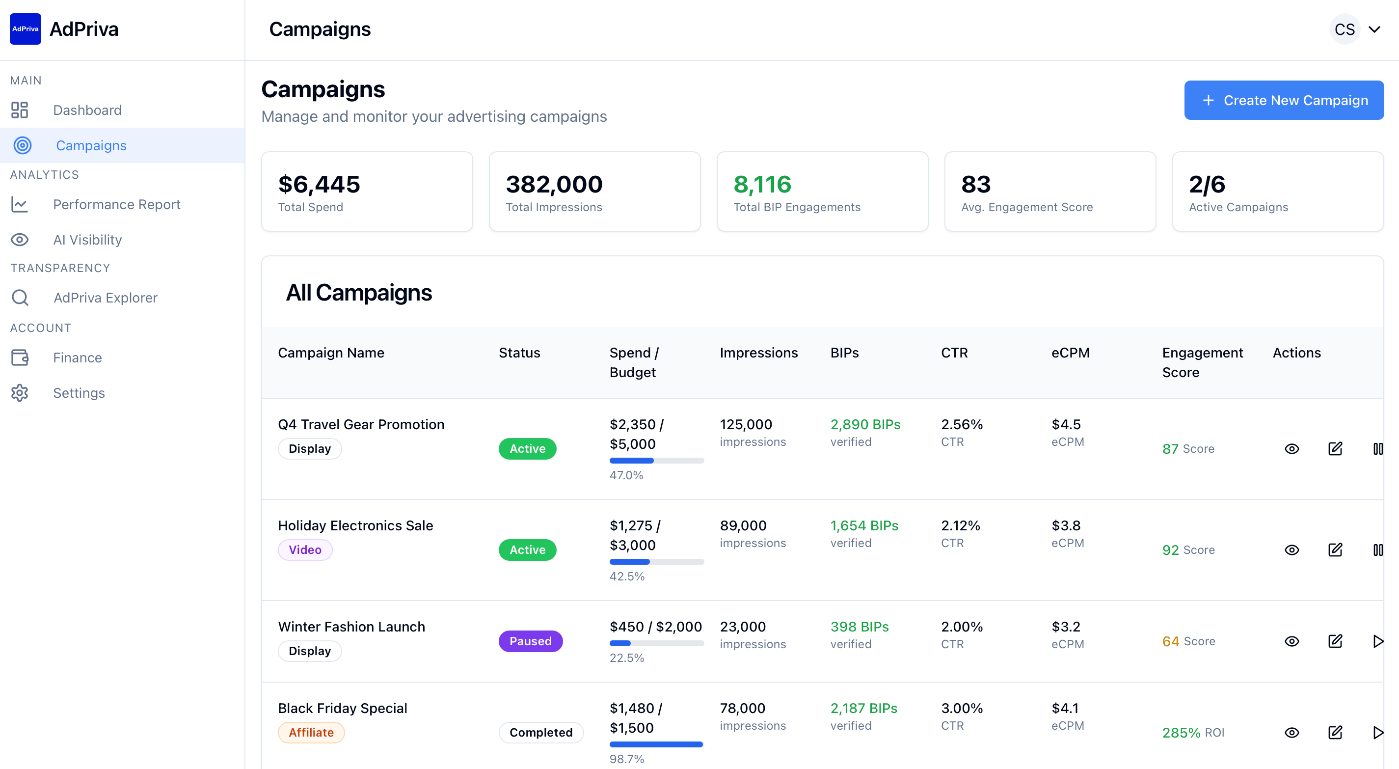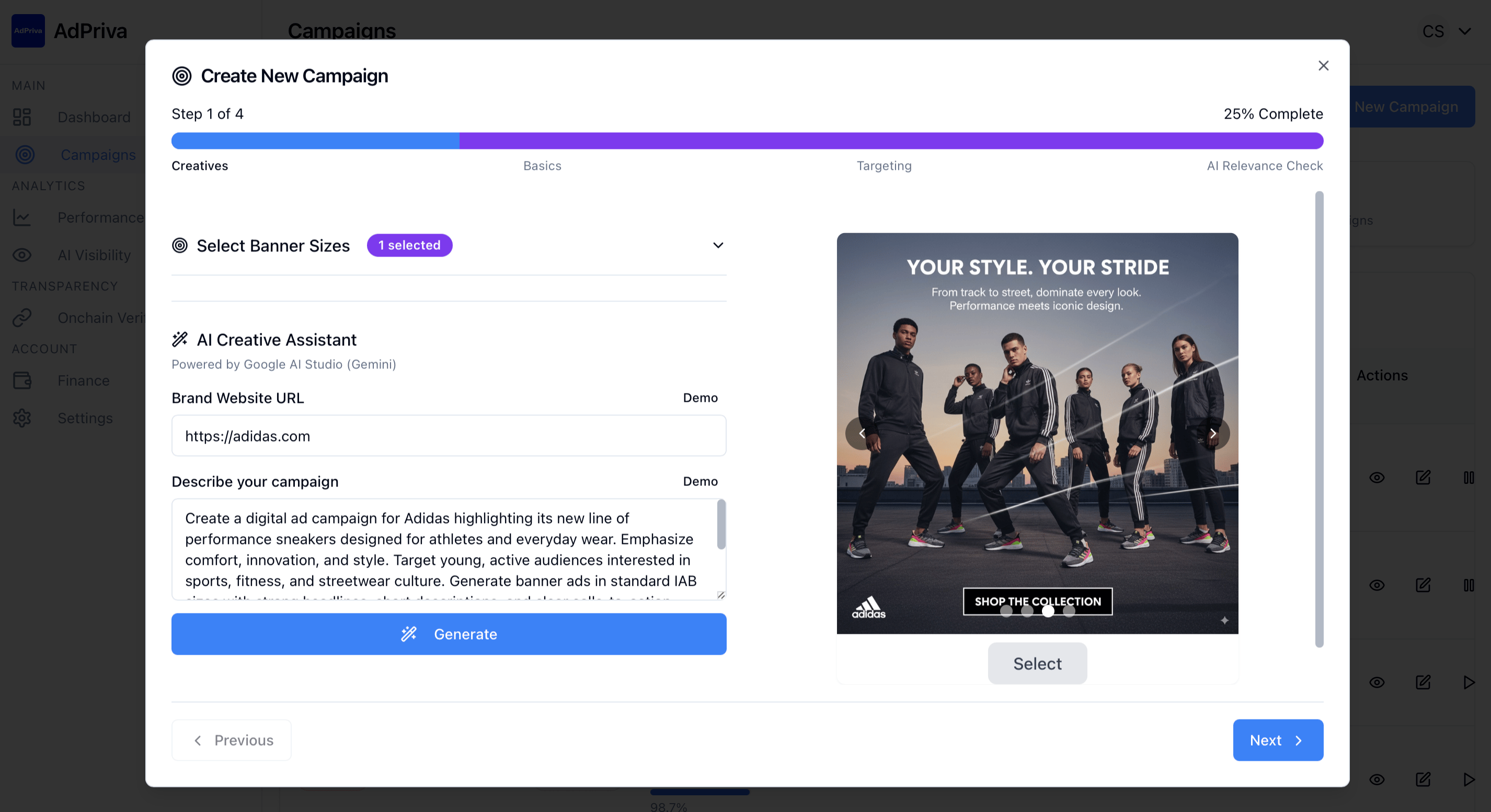 Launch ad or affiliate campaigns in minutes with the AdPriva dashboard. AI-assisted creative generation supported.