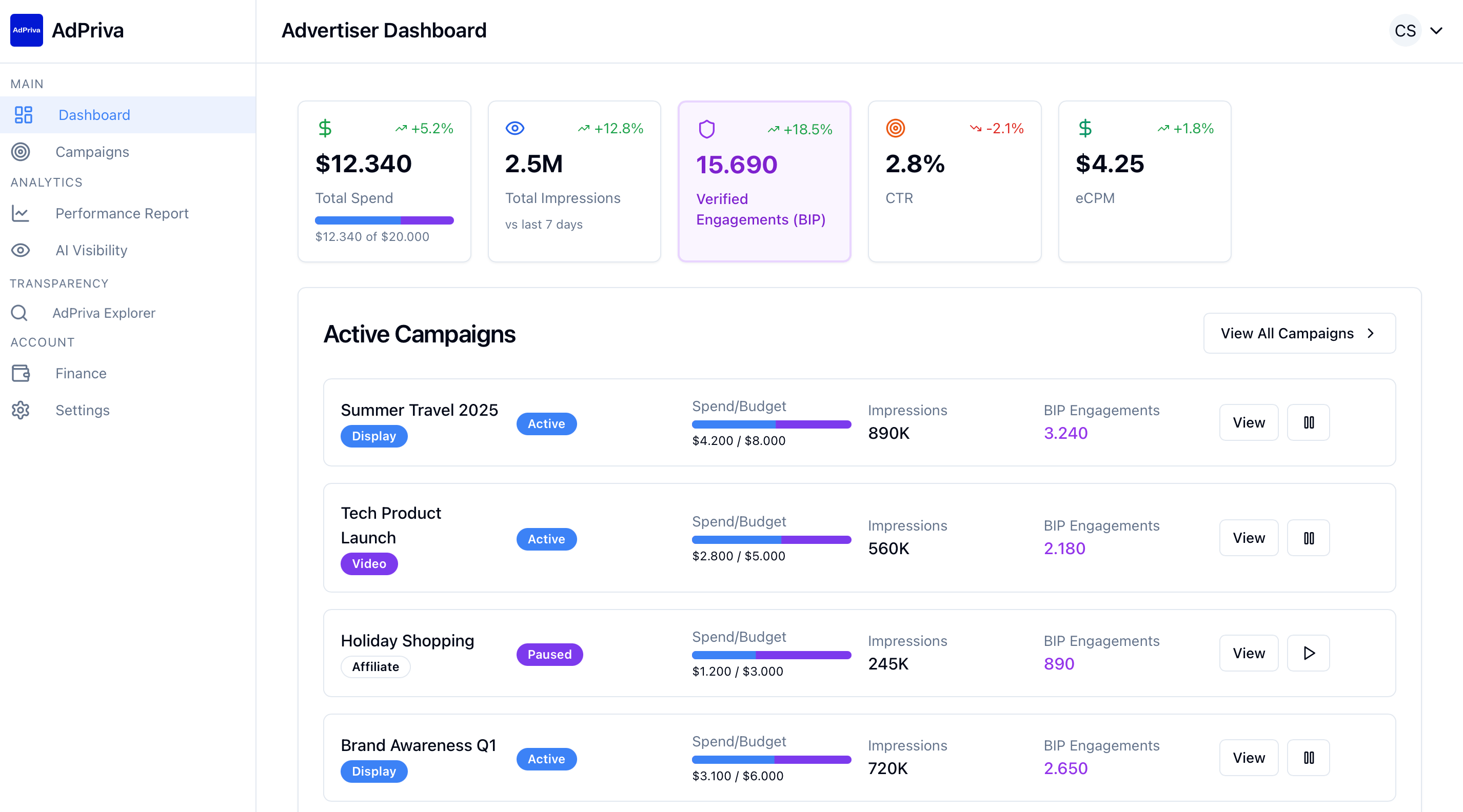 - Transparent Analytics → Real-time proof verification dashboard + exportable certificates. Public verification via AdPriva Explorer.